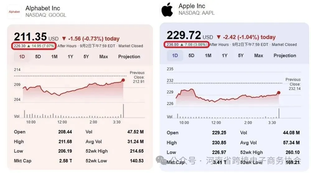 苹果股价也上涨超3%,作为谷歌最重要的合作伙伴之一,苹果每年从谷歌方面拿走超200亿美元,并将谷歌搜索设为Safari的首选搜索引擎。