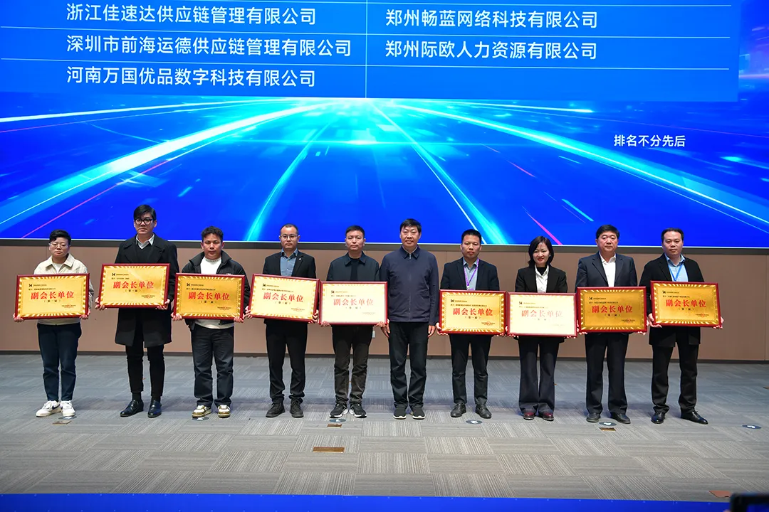 季玉成巡视员、万松博副总经理为河南中大门仓储服务有限公司、郑州航空港区陆港供应链管理有限公司、河南豫卖跨境企业管理咨询有限公司等18家副会长单位授牌